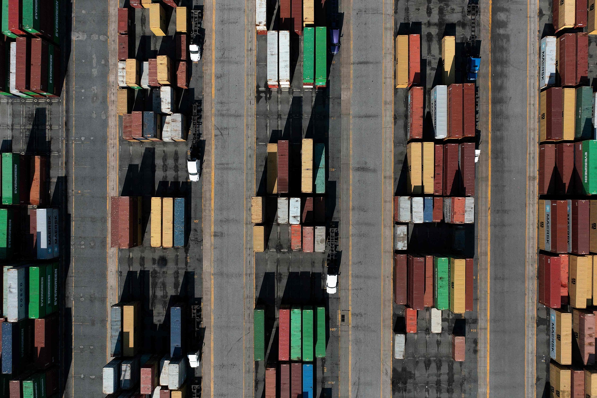 2021年10月14日,美國馬里蘭州,航拍巴爾的摩港口準備運輸的貨物集裝箱 圖自視覺中國