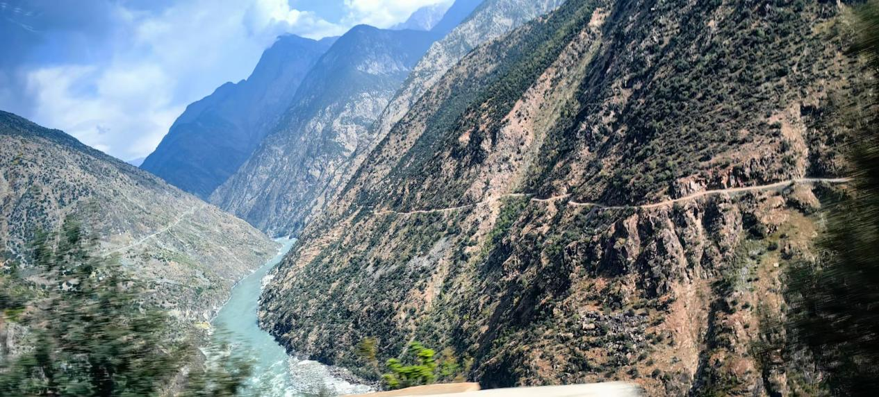 到了達蘇鄉鄉界,看到一塊大牌子,上面寫着“歡迎來到水利王國”。過了達蘇鎮,我們沿着山崖上的縣度(崖道)提心吊膽地往前走,一路看到的是高牆圍着警衞嚴守的中國人修建的達蘇大壩和巴沙大巴工地。路上也會看到中國工程技術人員並與他們合影。