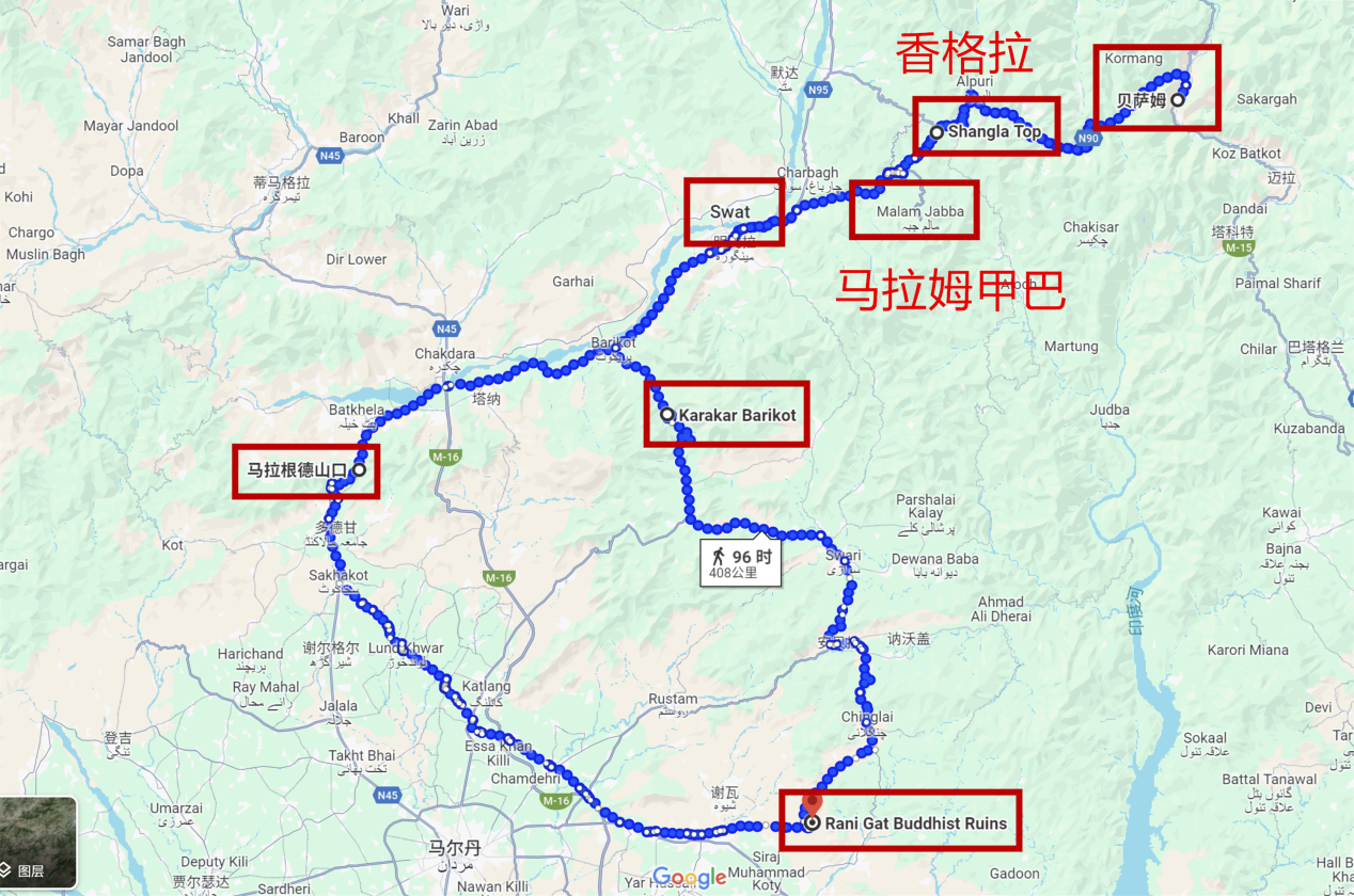 斯瓦特有兩個山口通向印度河,一個是經拉尼·噶特佛教聖山去通天河(靠近白沙瓦的印度河洪德渡口)的卡拉喀山口,一個是經貝沙姆鎮去達蘇的香格拉山口。去年6月和11月我兩次去香格拉、貝沙姆和達蘇考察,半個月前我剛剛去卡拉喀山口考察。