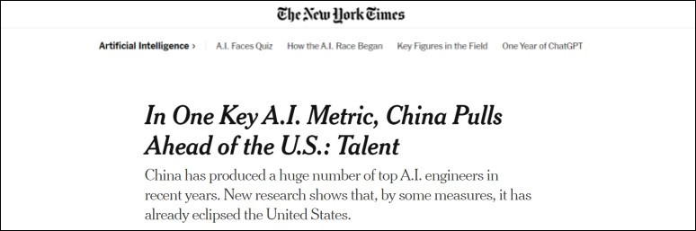 《紐約時報》發佈題為“人工智能競爭中,中國人才培育趕超美國”的文章