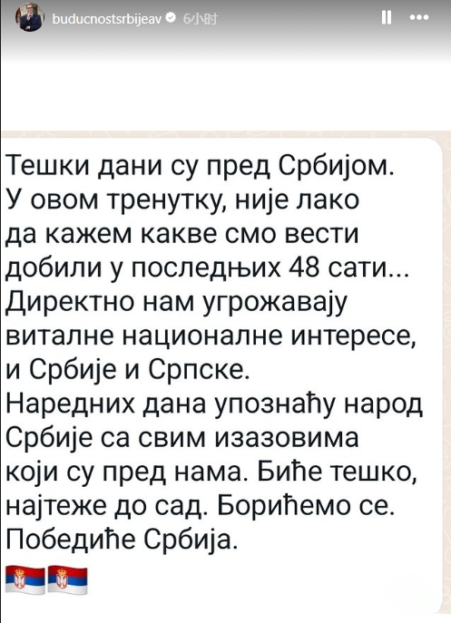 他在Ins動態和Ins story上同時上傳了這篇以圖片形式發佈的簡短聲明。上面寫道:“塞爾維亞即將迎來艱難的日子。此時此刻,很難説出我們在過去48小時內收到了什麼樣的消息……它們直接威脅到對於塞爾維亞和塞爾維亞族至關重要的國家利益。在接下來的幾天裏,我將向塞爾維亞公民通報我們所要面臨的所有挑戰。這將是艱難的,而且是迄今為止最艱難的。我們正在戰鬥。塞爾維亞終將獲勝。”