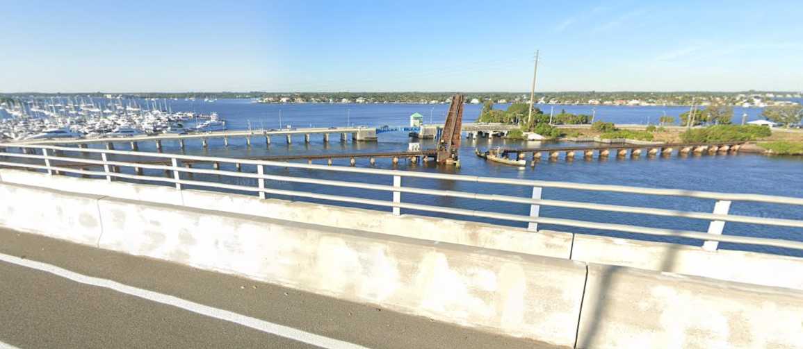 聖露西河河灣是一個類似縮小版杭州灣的“喇叭型”出海口。原本這裏有一座建於大蕭條時代、通行汽車行人的老開合橋(“老羅斯福橋”);1996年為美國一號公路建了一座新橋(新羅斯福大橋)。雖然美國一號公路不是高速路,但新橋按高速標準修建,非機動車和行人不能通過。通行FEC火車的老鐵路開合橋就夾在兩座公路橋中間,“亮線”在這裏跨海而過。見下兩圖: