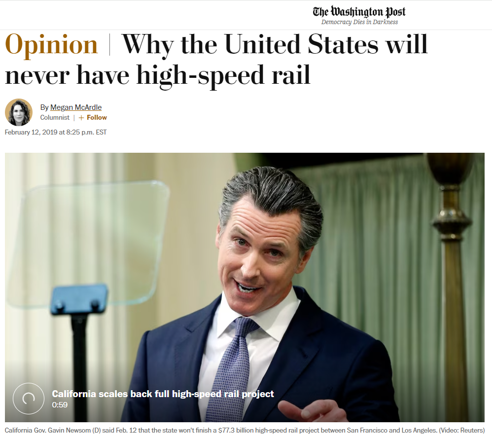 《華盛頓郵報》專欄作者麥卡德爾(Megan McArdle)在《美國為什麼永遠都不會有高鐵》一文中總結了美國高鐵建設困局中一些老生常談的問題:人口密集大城市間距離過遠;美國法律在徵地問題上賦予政府的權力過於受限;美國法律體系在政府基礎設施項目中為公民提供了大量破壞工具;美國的基建成本遠高於世界上任何其他國家。最終她得出結論:“美國可能永遠無法用高鐵(把舊金山和洛杉磯)連接在一起。”