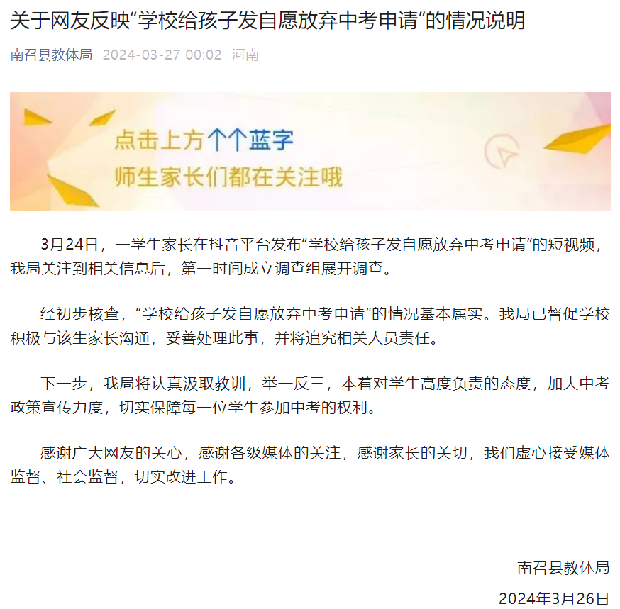 3月24日,一學生家長在抖音平台發佈“學校給孩子發自願放棄中考申請”的短視頻,我局關注到相關信息後,第一時間成立調查組展開調查。