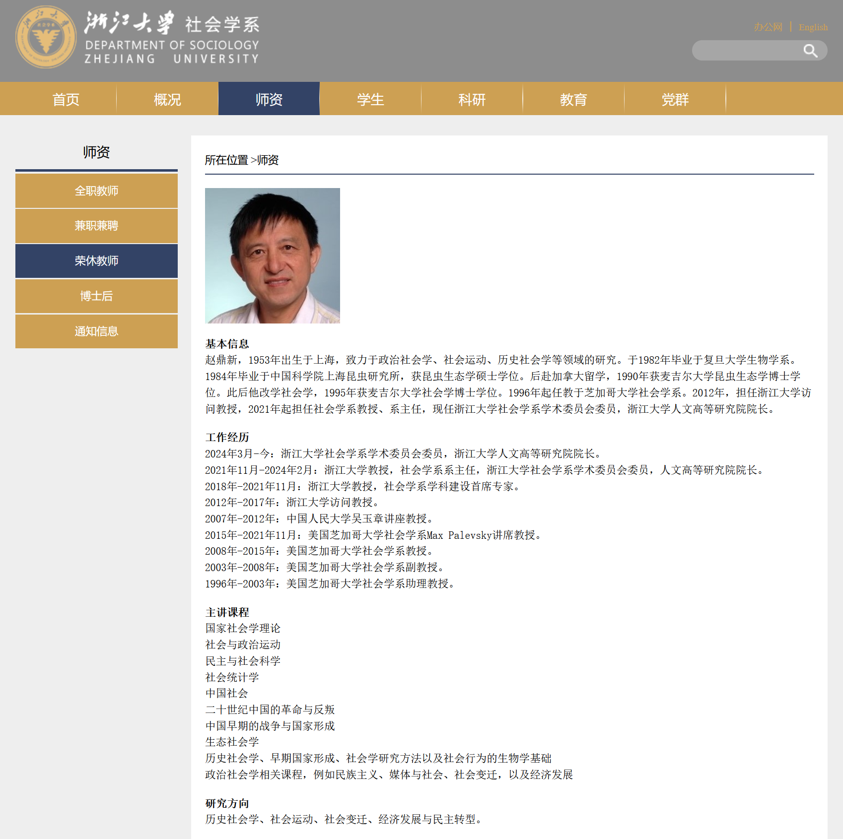 浙大社會學系三度更新趙鼎新資料,再度列入“榮休教師”欄目