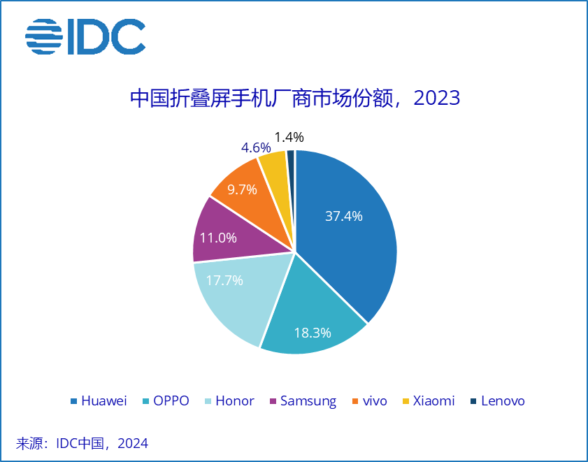 根據IDC數據,2023年華為在中國摺疊屏市場佔據37.4%的份額,相比2022年收窄了10個百分點;三星被OPPO(18.3%)和榮耀(17.7%)反超,從第二掉到第四,份額僅剩11%;vivo以9.7%的份額排名第五,比上年提升2個百分點;小米份額掉至4.6%,排名第六。