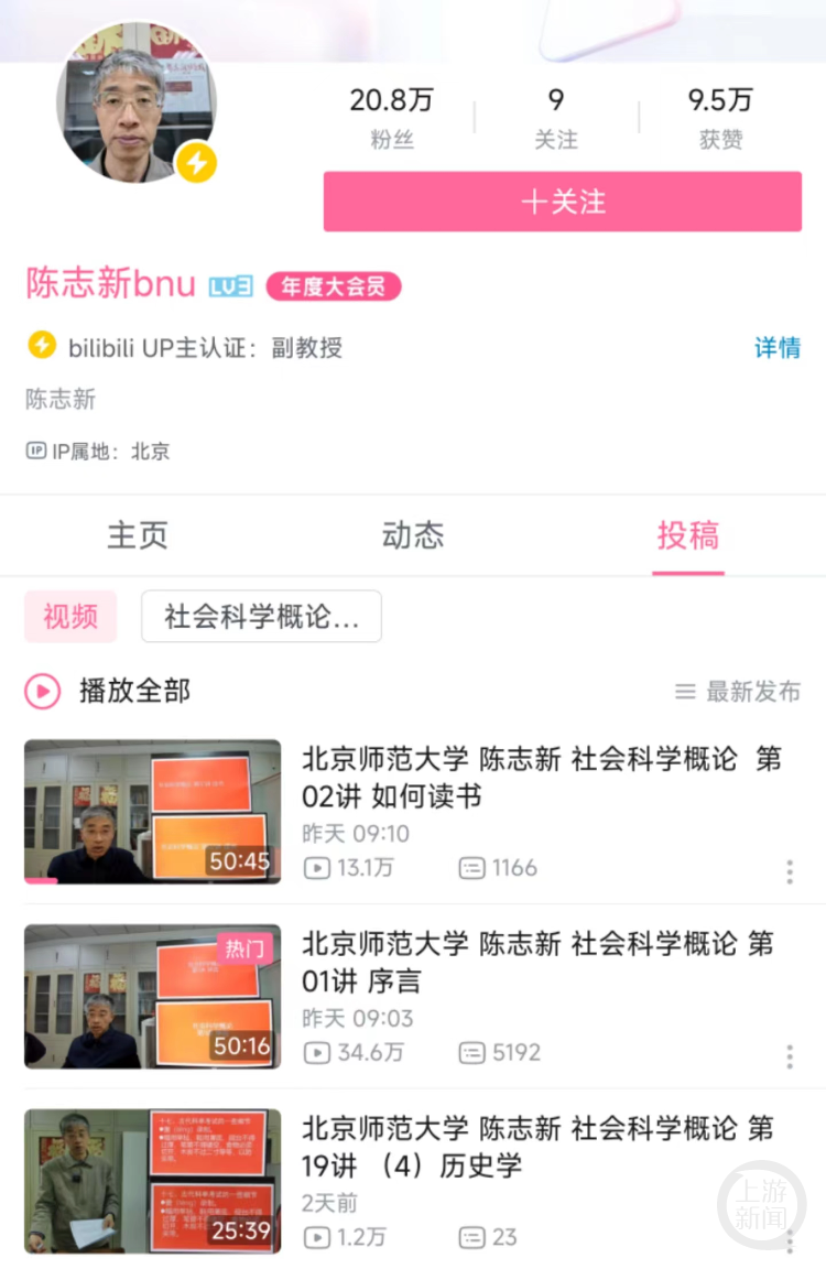 3月27日下午,多位北京師範大學的學生在網上發帖稱,有一位老師在教室推薦自己一門在B站上開設的《社會科學概論》的網絡課程,“免費的、沒有學分、沒有作業”。老師的誠意也感動了學生和網友,一夜漲粉20萬,28日上午粉絲已經超過20萬。28日,上游新聞記者聯繫上了這位北師大老師,但他婉拒了採訪。校方表示,目前正在瞭解相關情況。