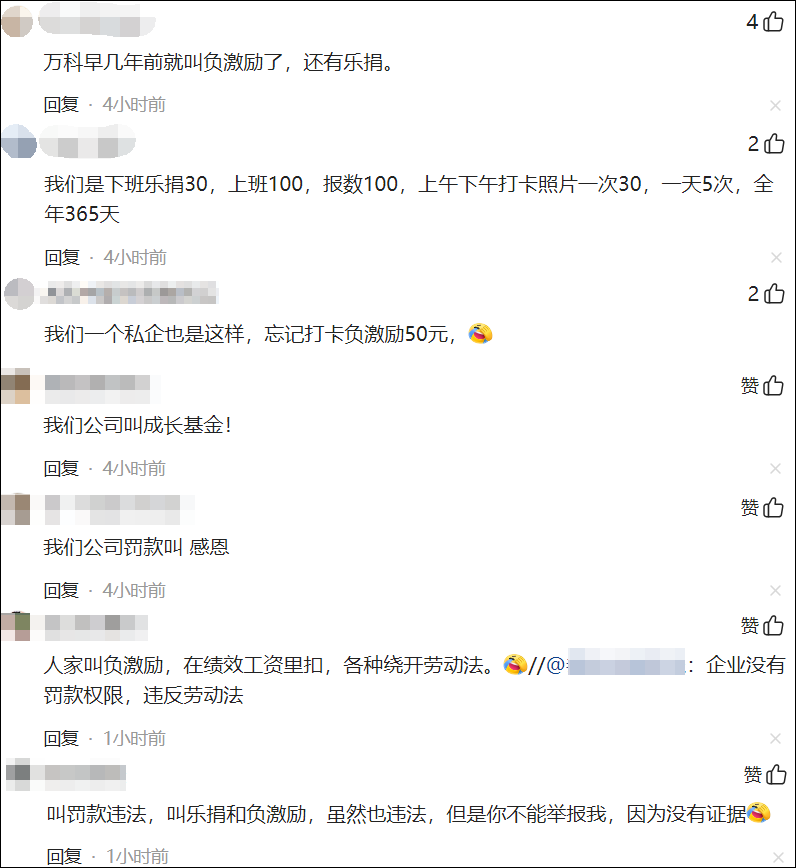 網傳通報中的“負激勵”制度引發網友熱議,有不少網友稱自己所在的公司也有“負激勵”制度,還有網友表示此類罰款制度還有“樂捐”“成長基金”“感恩”等不同叫法。也有網友指出,企業沒有罰款權限,這些變相稱呼是為了繞開勞動法。