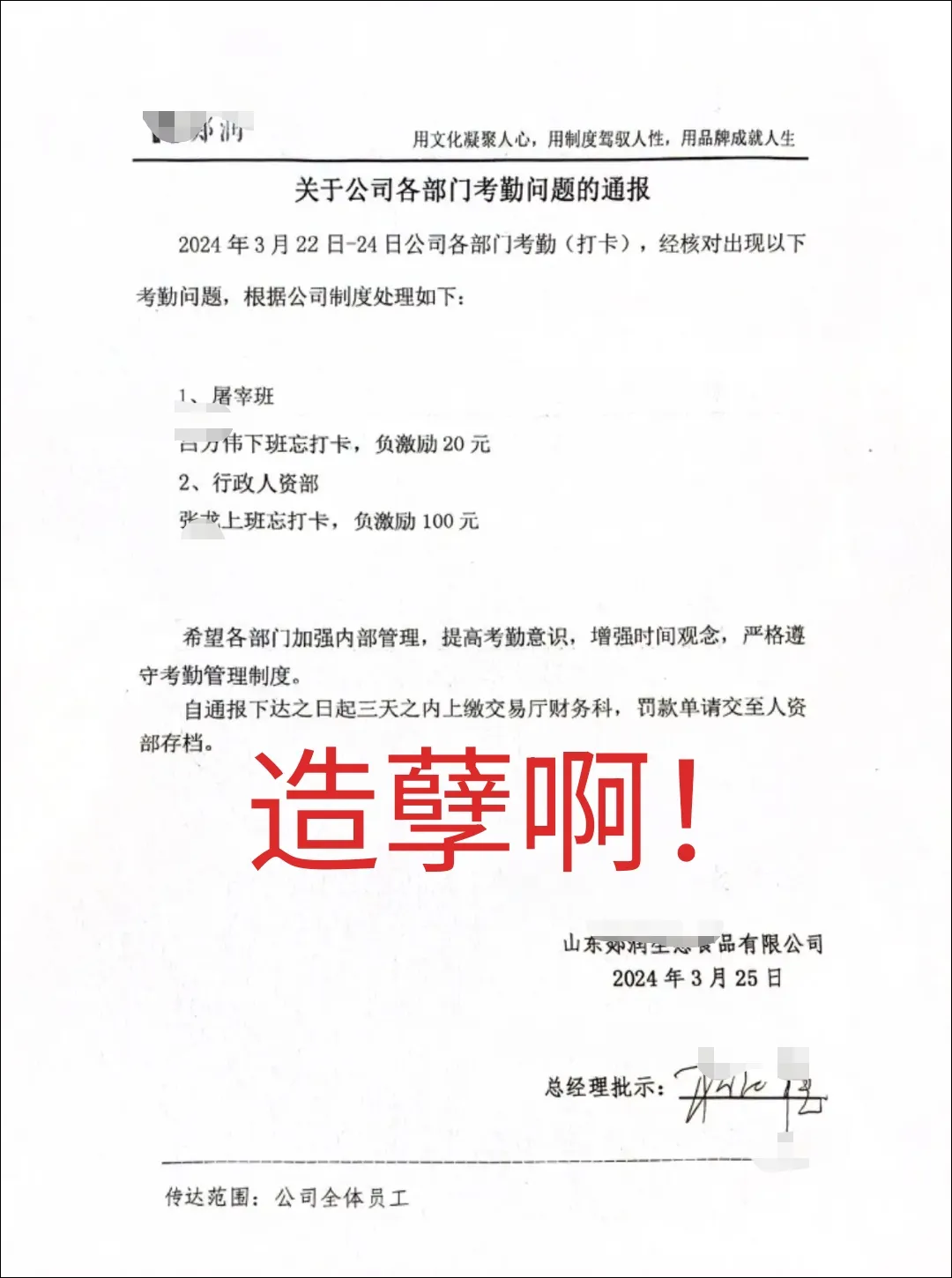 該公司遭曝光的一則考勤通報顯示,3月22日至24日公司各部門的考勤打卡經核對出現問題,根據公司制度,一名屠宰班員工因下班忘打卡,負激勵20元,另一名行政人資部員工因上班忘打卡,負激勵100元。該通報顯示的傳達範圍為公司全體員工。