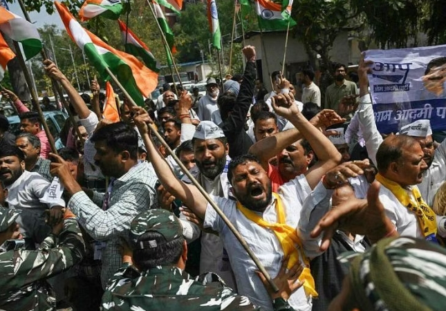 3月26日,德里首席部長凱吉里瓦爾的支持者在莫迪位於新德里的官邸外示威抗議/法新社