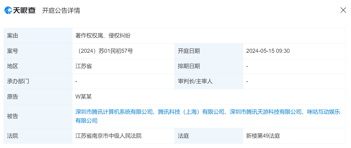 天眼查信息顯示,本次涉事案件案由為著作權權屬、侵權糾紛,原告為W某某,被告包括深圳市騰訊計算機系統有限公司、騰訊科技(上海)有限公司、深圳市騰訊天遊科技有限公司等,該案將於5月15日在江蘇省南京市中級人民法院開庭審理。