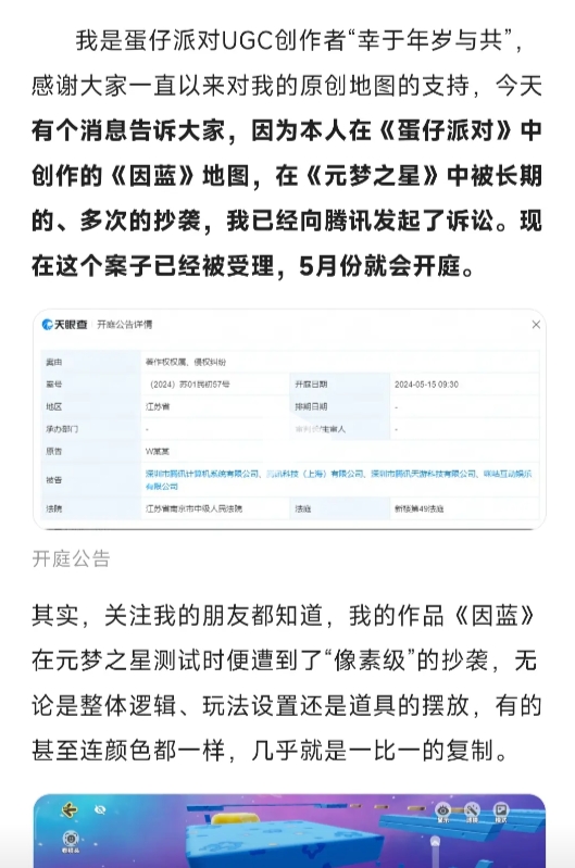 3月28日,網易《蛋仔派對》的UGC地圖作者@仟中酒在抖音發佈消息稱,因為創作的地圖在《元夢之星》中被長期、多次地抄襲,已經向騰訊發起訴訟,案件已被受理,將於5月開庭。