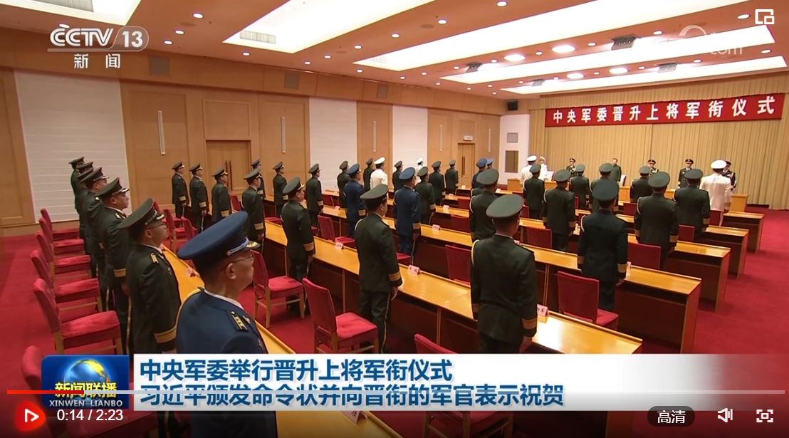 中央軍委舉行晉升上將軍銜儀式 習近平頒發命令狀並向晉銜的軍官表示祝賀