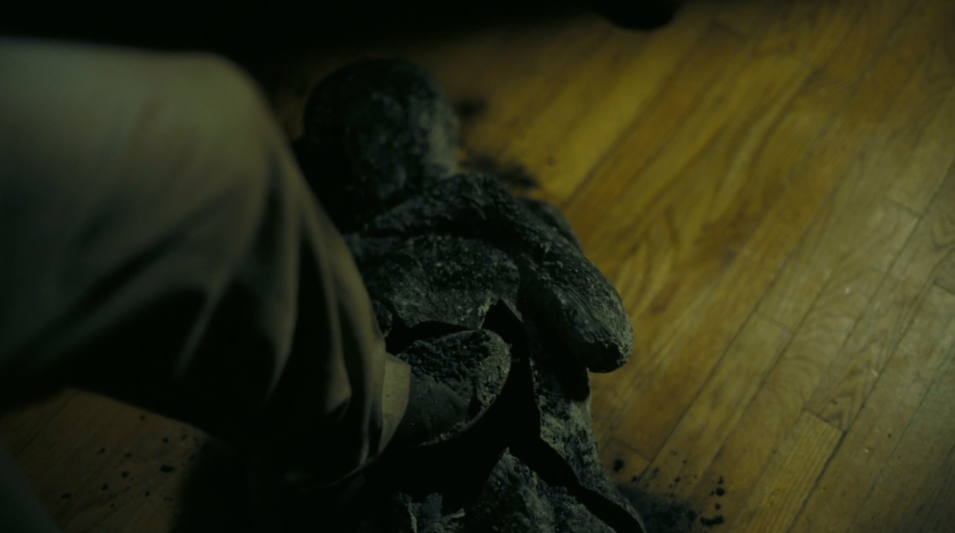 而這個鏡頭過後沒有多久,就給出了象徵着被核爆瞬間碳化的屍體的黑色雕塑。