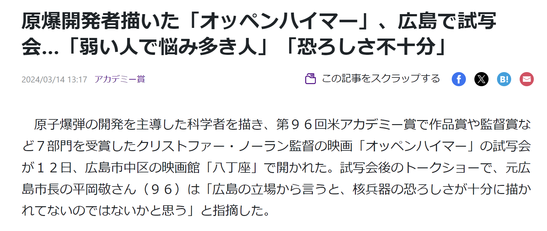 在日本這些年來的宣傳口徑中,只要提到核爆就統一口徑描述傷害,而不反思戰爭。這個思路延續到對電影《奧本海默》的評價,也難怪廣島的前市長能説出“從廣島的立場來看,本片並沒有足夠地描述核武器的恐怖之處”這樣的話來。