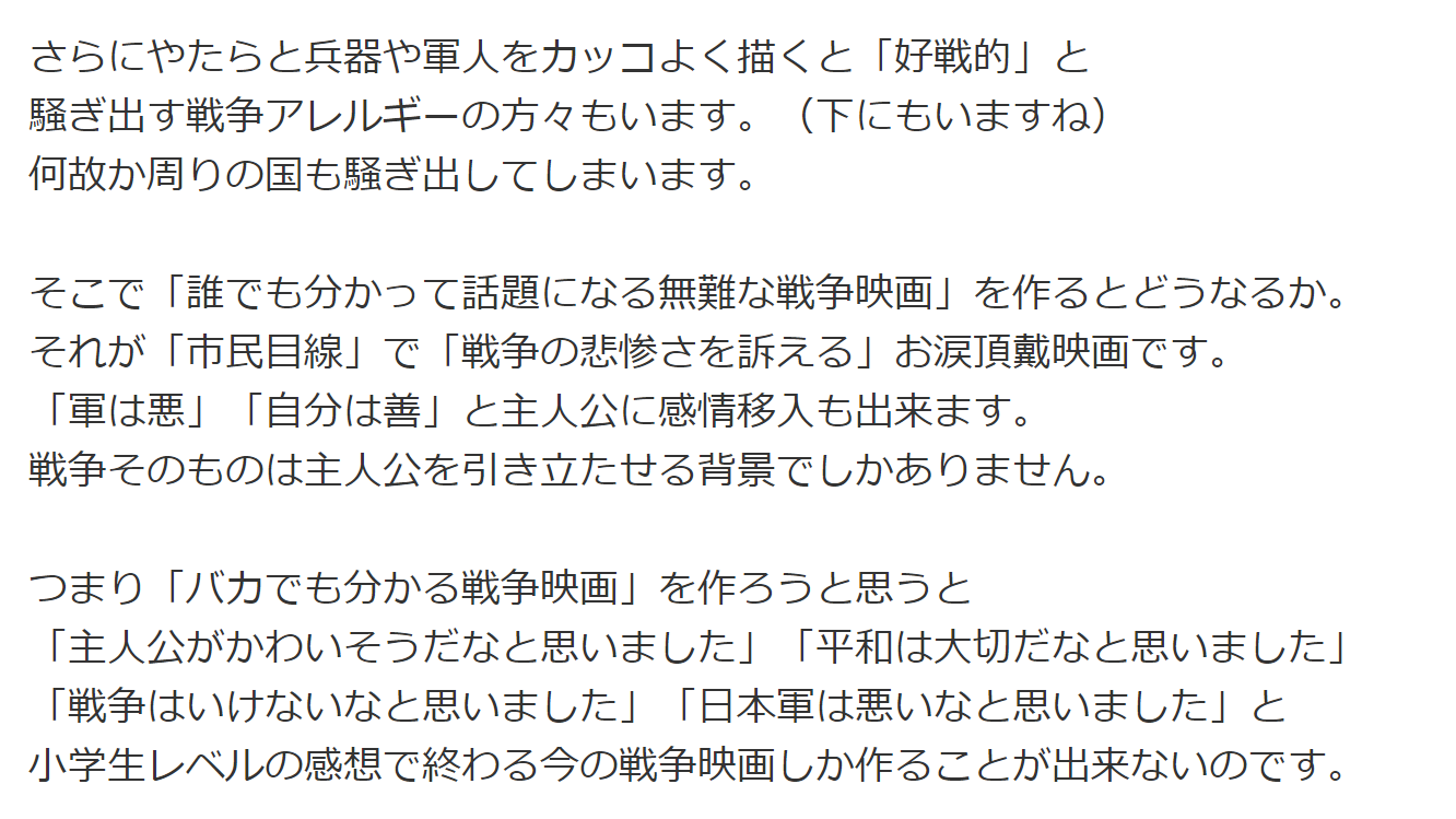 對於這個問題,另一名日本網民的回答是:反正只要描繪軍人和武器,就會有戰爭過敏的日本人出來反對,周邊國家也會莫名其妙地開始鬧騰。最後只能去拍攝傻子都能懂的戰爭,只要是主角的家人死了,就可以訴諸戰爭的殘酷,騙人眼淚。最後就可以帶入軍隊為惡,自己為善的思考,而戰爭就成為了給主人公做嫁衣的背景。看了電影的人,也只會有一些小學生一樣的感想,比如覺得主人公很可憐,覺得和平很重要,覺得不可以有戰爭,覺得日本軍隊是惡。
