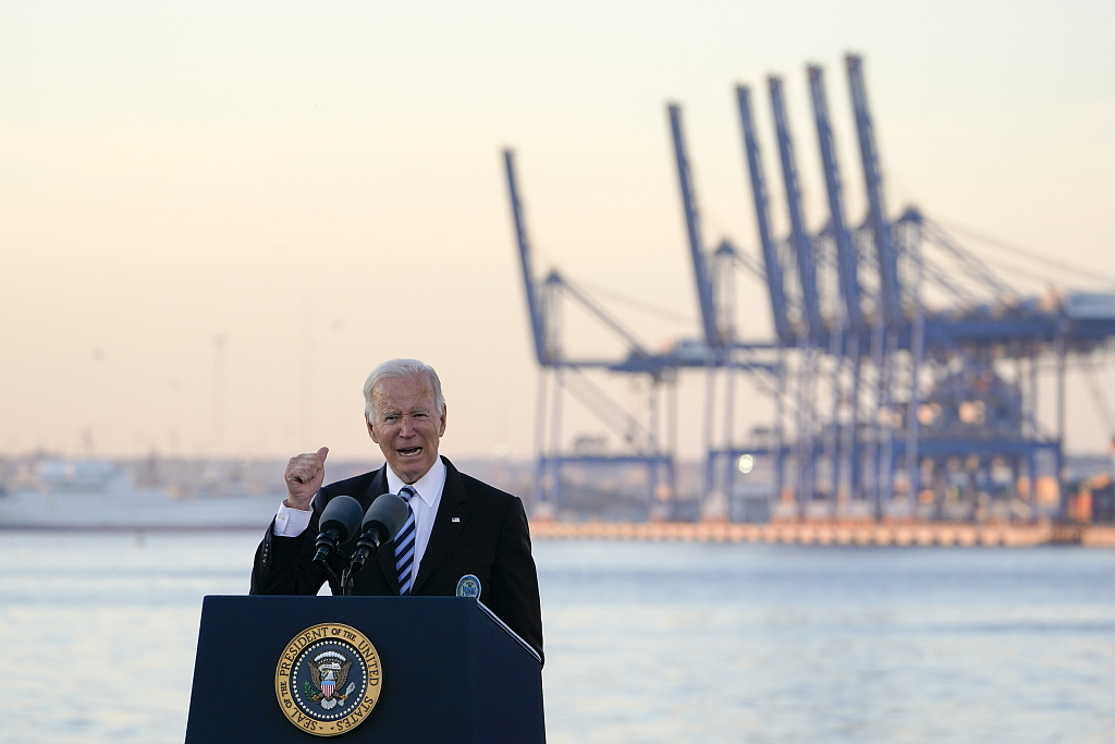 當地時間2021年11月10日,美國總統拜登前往美國馬里蘭州的巴爾的摩港,談論當前美國的通脹問題和基建計劃。發表講話的背景是西格特(Seagirt)海運碼頭,停有上海振華重工(ZPMC)製造的“新巴拿馬式”起重機。(圖源:視覺中國)