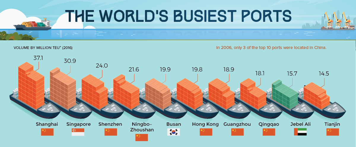 世界上最繁忙的港口排名前十中,中國獨佔7席,而在2006年,中國只佔3席(圖片來源:世界經濟論壇)