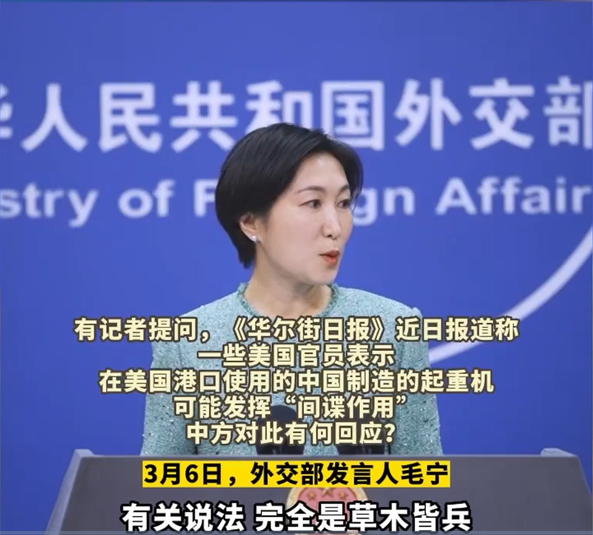 美方稱美國港口的中國起重機起“間諜作用”,2023年3月6日外交部發言人毛寧回應:有關説法完全是草木皆兵(圖片來源:觀察者網視頻截圖)
