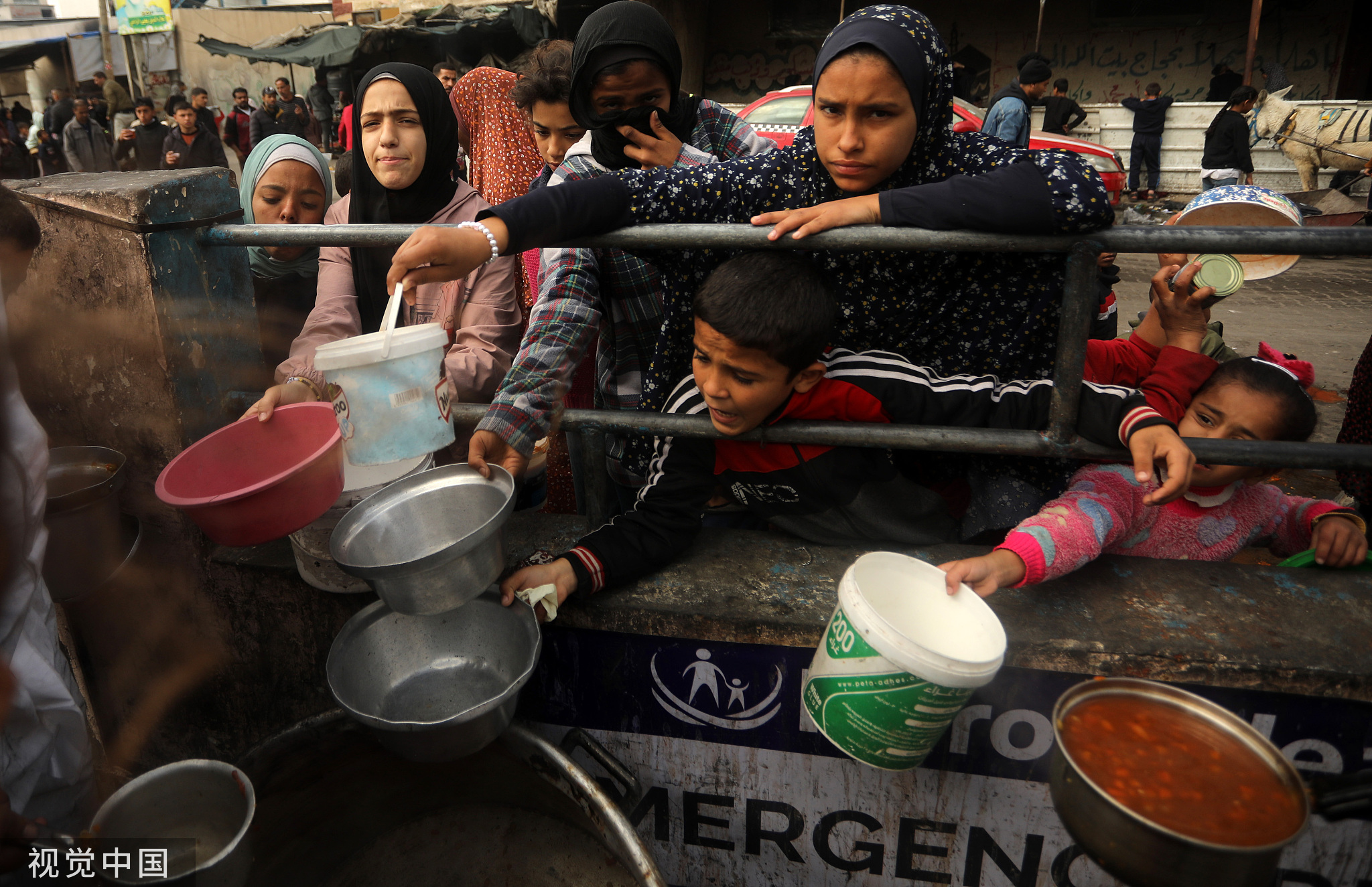 當地時間3月7日,加沙地帶拉法,巴勒斯坦兒童等待領取慈善廚房烹製的食物 /視覺中國