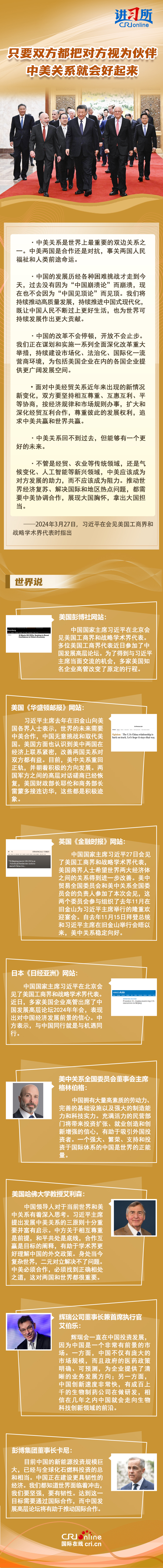3月27日,中國國家主席習近平在北京會見美國工商界和戰略學術界代表時指出,中美各自的成功是彼此的機遇。只要雙方都把對方視為夥伴,相互尊重、和平共處、合作共贏,中美關係就會好起來。