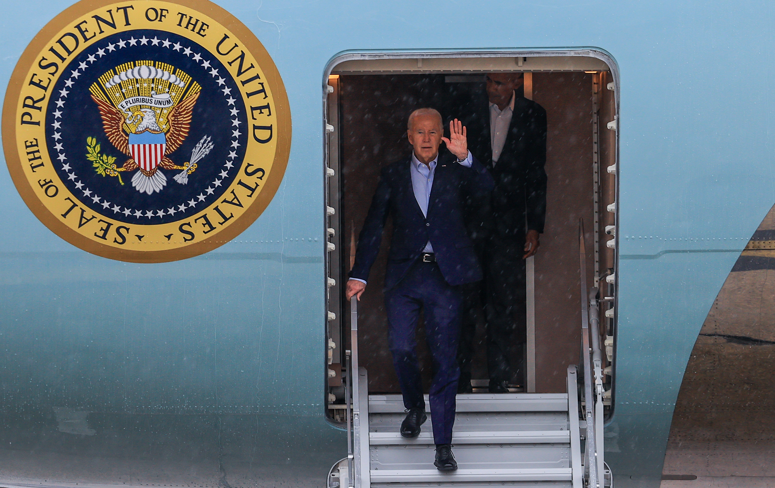 當地時間2024年3月28日,美國紐約,美國總統拜登乘坐“空軍一號”抵達肯尼迪國際機場。圖源:視覺中國