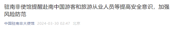 近期,南媒體報道,當地搶劫、綁架、謀殺等惡性案件高發,治安形勢不斷惡化。駐南非使館再次提醒赴南中國遊客、旅遊從業人員及旅南僑胞切實提高安全意識,加強風險防範: