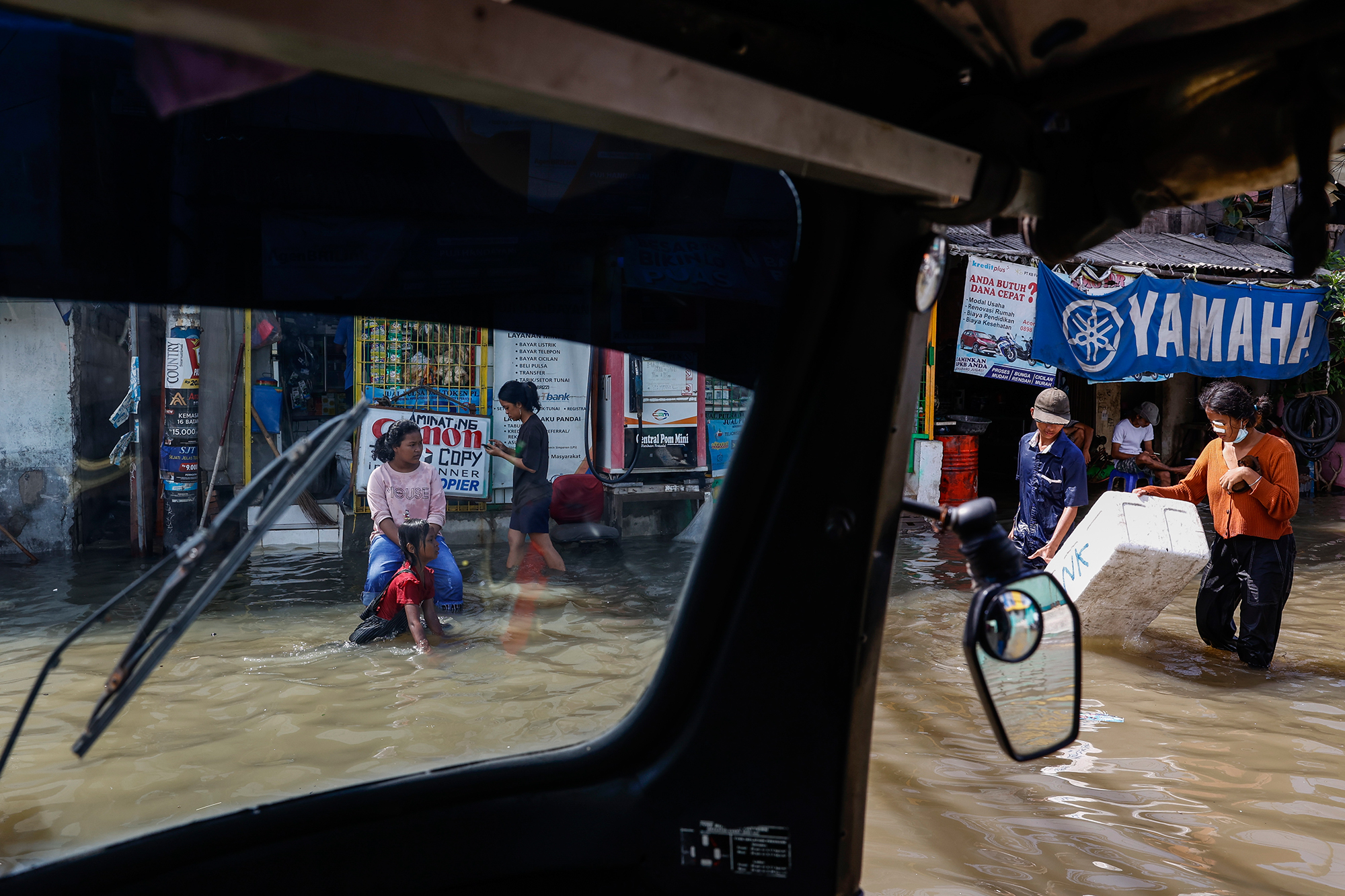 2021年11月9日,雅加達,人們在漲潮的洪水中涉水。根據報告,雅加達西北部地區正以每年7至10釐米的速度下沉,而東北部地區則在2至4釐米之間,使雅加達成為世界上下沉最快的城市之一。 圖自IC Photo