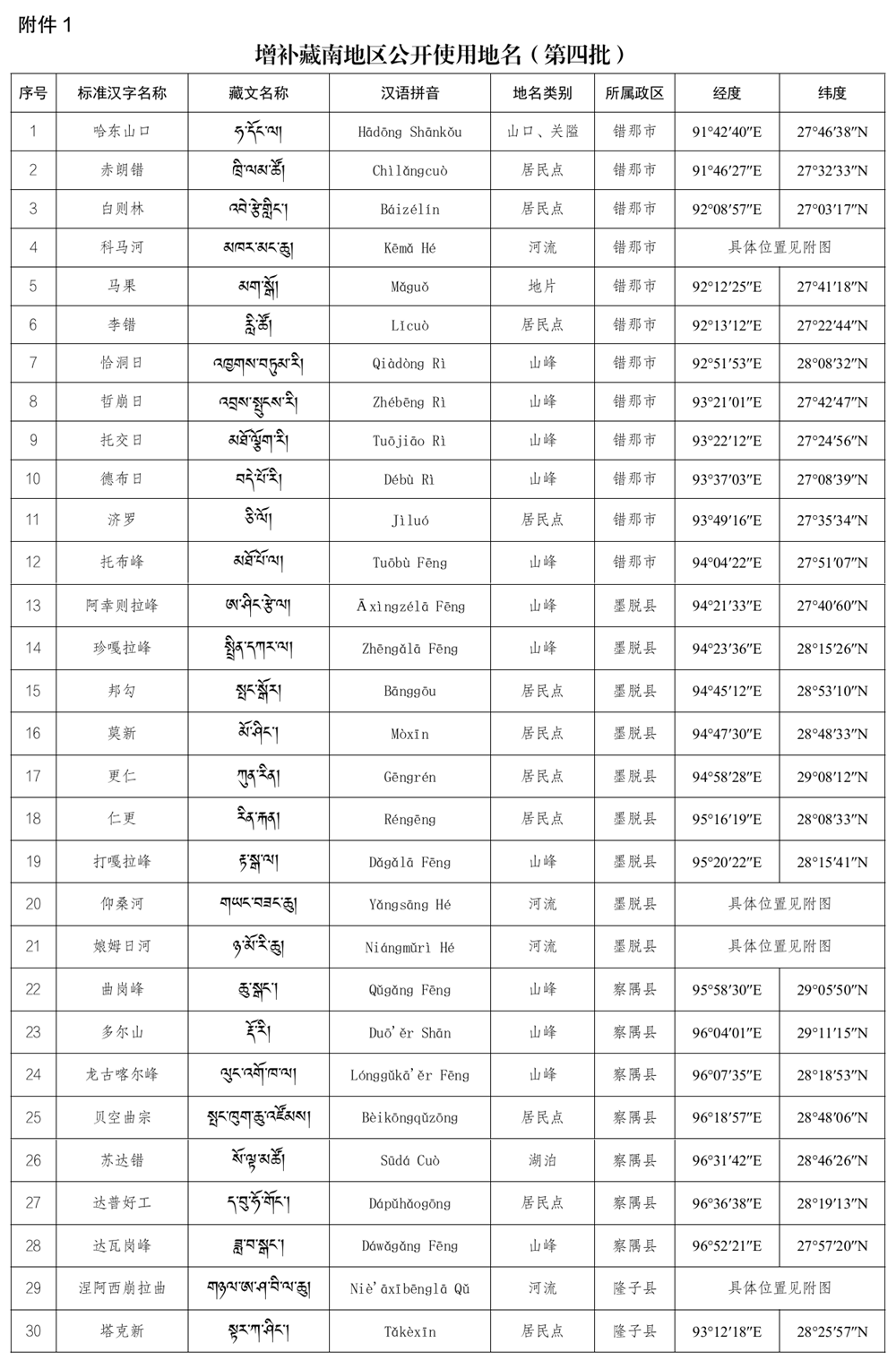 據民政部網站消息,民政部30日發佈關於增補藏南地區公開使用地名(第四批)的公告,根據國務院地名管理的有關規定,民政部部會同有關部門對我國藏南地區部分地名進行了標準化處理。現正式公佈第四批增補藏南地區公開使用地名(共30個)。