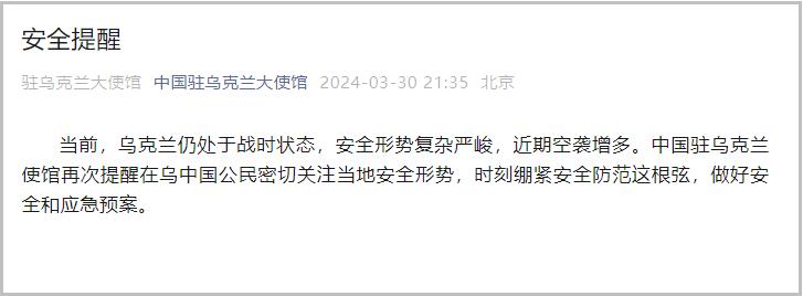 3月30日,中國駐烏克蘭大使館公眾號發佈安全提醒稱,當前,烏克蘭仍處於戰時狀態,安全形勢複雜嚴峻,近期空襲增多。中國駐烏克蘭使館再次提醒在烏中國公民密切關注當地安全形勢,時刻繃緊安全防範這根弦,做好安全和應急預案。