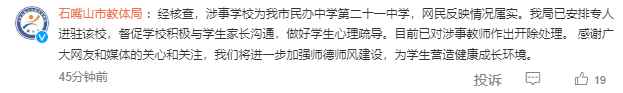 @石嘴山市教體局 30日也在相關微博下方回應稱,經核查,涉事學校為我市民辦中學第二十一中學,網民反映情況屬實。我局已安排專人進駐該校,督促學校積極與學生家長溝通,做好學生心理疏導。目前已對涉事教師作出開除處理。 感謝廣大網友和媒體的關心和關注,我們將進一步加強師德師風建設,為學生營造健康成長環境。