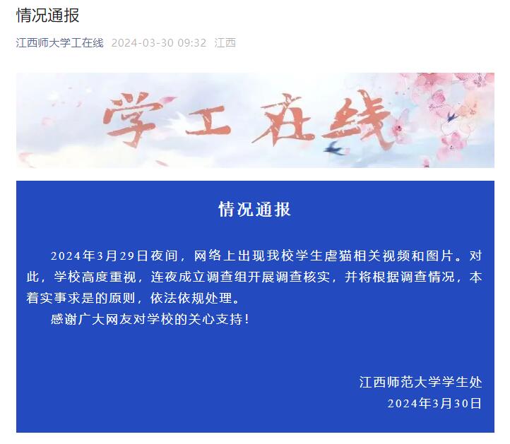對此,3月30日,江西師範大學學生處通報稱,29日夜間,網絡上出現我校學生虐貓相關視頻和圖片。對此,學校高度重視,連夜成立調查組開展調查核實,並將根據調查情況,本着實事求是的原則,依法依規處理。