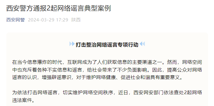 據西安網警微信公眾號29日消息,為依法打擊網絡謠言,切實維護網絡空間秩序,近日,西安網安部門依法查處2起網絡違法案件。