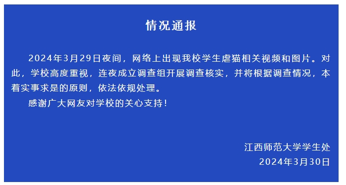 網傳“男生在宿舍虐貓”?江西師範大學通報:連夜成立調查組