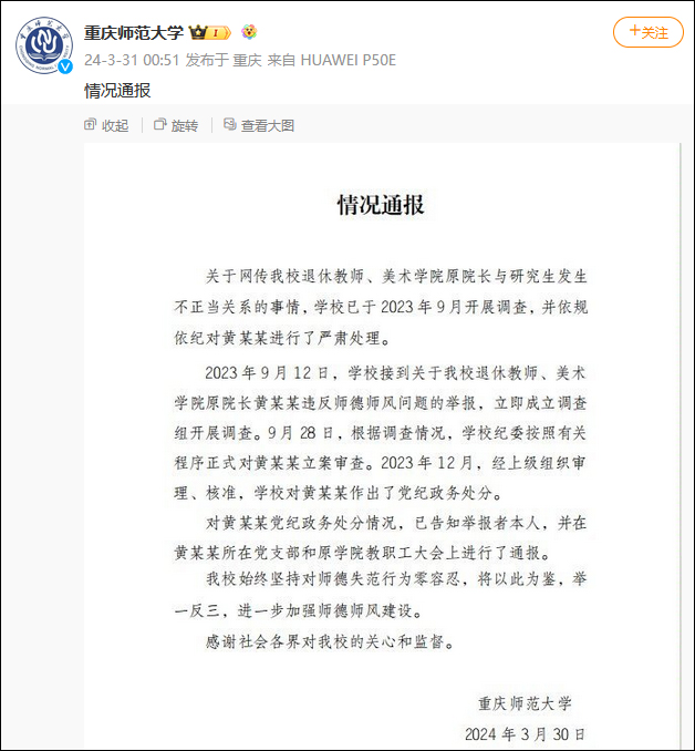 @重慶師範大學 3月31日發佈情況通報稱,關於網傳該校退休教師、美術學院原院長與研究生髮生不正當關係的事情,學校已於2023年9月開展調查,並依規依紀對黃某某進行了嚴肅處理。