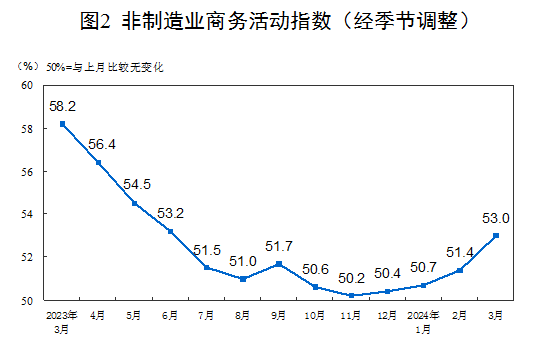 3月份,非製造業商務活動指數為53.0%,比上月上升1.6個百分點,高於臨界點,表明非製造業景氣水平持續回升。