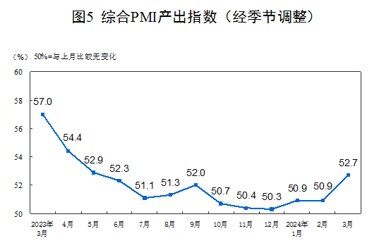 3月份,綜合PMI產出指數為52.7%,比上月上升1.8個百分點,高於臨界點,表明我國企業生產經營活動擴張加快。