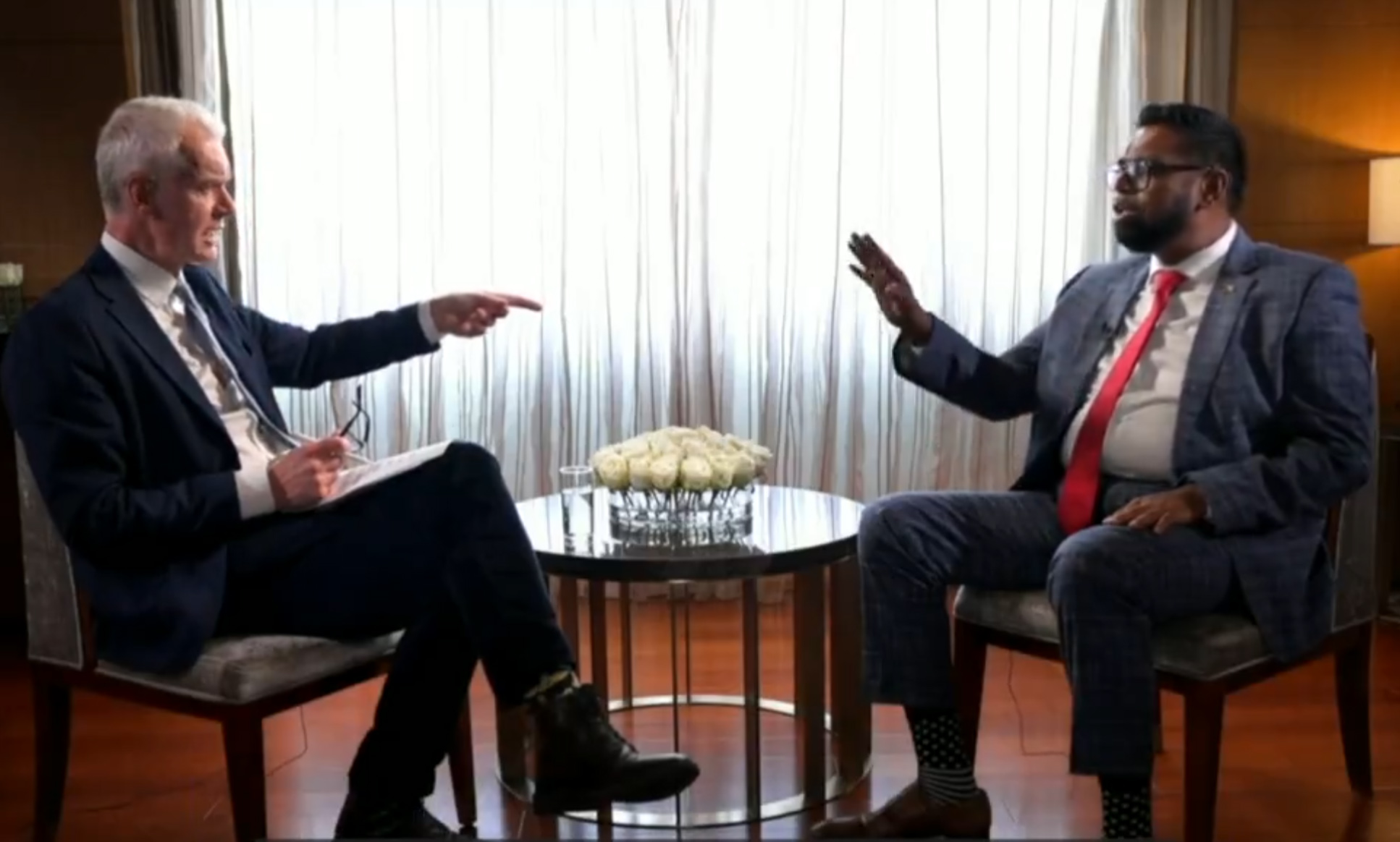 BBC主持人薩克爾(左)與圭亞那總統阿里對話 視頻截圖