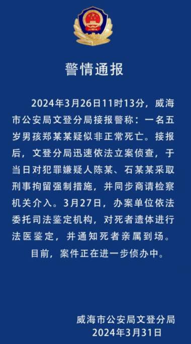 山東威海市公安局文登分局微信公眾號“文登警方在線”3月31日發佈警情通報稱,2024年3月26日11時13分,文登分局接報警稱:一名五歲男孩鄭某某疑似非正常死亡。接報後,文登分局迅速依法立案偵查,於當日對犯罪嫌疑人陳某、石某某採取刑事拘留強制措施,並同步商請檢察機關介入。