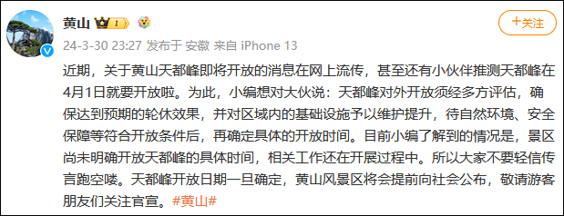 中國黃山風景區官方微博@黃山 3月30日發文回應網上流傳的黃山天都峯4月1日即將開放的消息。