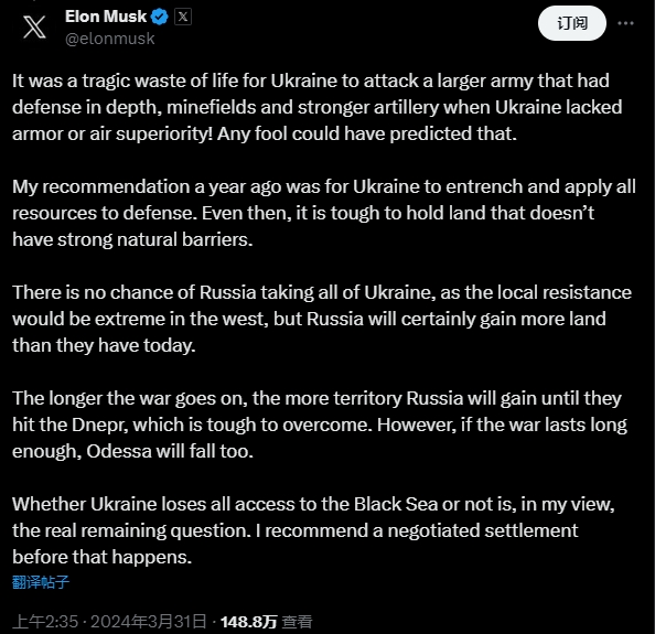 (觀察者網訊)3月31日,美國特斯拉、SpaceX和社交媒體X(原推特)公司老闆馬斯克在X平台發文,建議烏克蘭通過談判解決俄烏衝突,因為在缺乏裝甲和空中優勢的情況下,“戰爭持續的時間越長,俄羅斯獲得的領土就越多,最後敖德薩也有可能淪陷”。