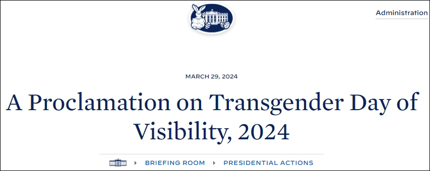 拜登在29日發佈公告稱,“我,美利堅合眾國總統小約瑟夫·羅比內特·拜登,以美國憲法和法律賦予我的權力,特此宣佈2024年3月31日為‘跨性別現身日’。”