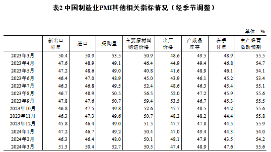 國家統計局網站3月31日發佈2024年3月中國採購經理指數運行情況。3月份,中國製造業PMI為50.8%,較上月上升1.7個百分點,時隔5個月重回擴張區間,景氣水平回升;非製造業商務活動指數為53.0%,比上月上升1.6個百分點,高於臨界點,景氣水平持續回升。與此同時,4月1日公佈的3月財新中國製造業PMI為51.1,微升0.2個百分點,創13個月新高。