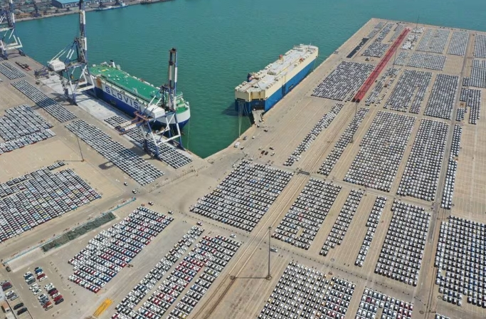 2023年5月3日,山東省煙台一處港口停車場停滿等待出口的汽車/路透社