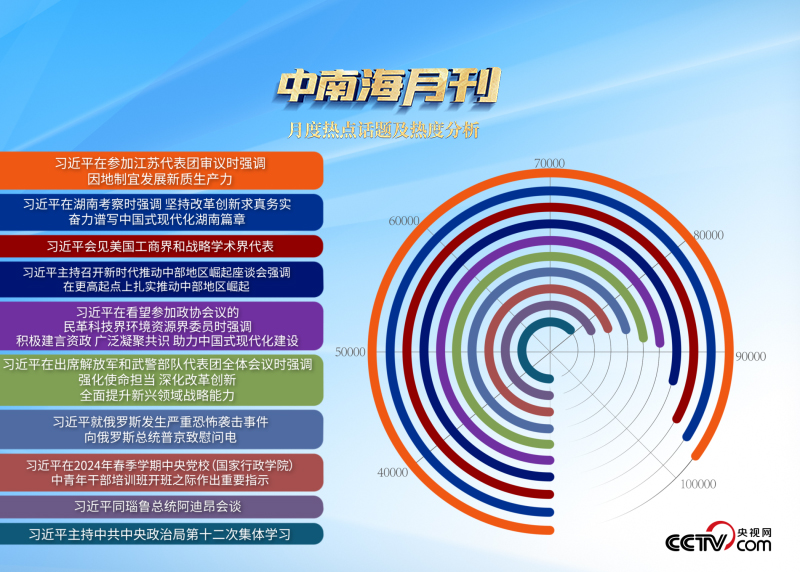 央視網“智聞”系統提取分析2024年3月全網時政新聞熱點顯示,“習近平總書記在湖南考察”“新時代推動中部地區崛起座談會”等相關話題備受關注。