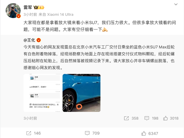 隨後,雷軍轉發了該條微博,並配文:“大家現在都是拿着放大鏡來看小米SU7,我們壓力很大。但很多拿放大鏡看的問題,可能不是問題。大家有空仔細看一下。”