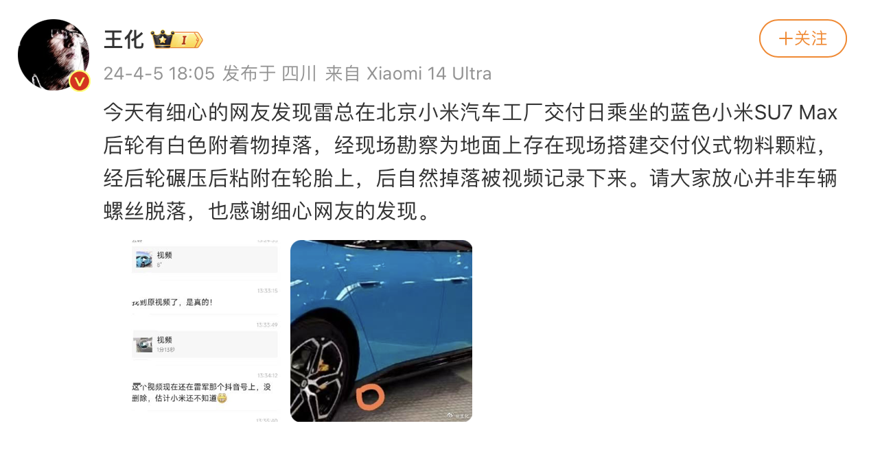 4月5日,小米王化在微博對此回應稱,經現場勘察為地面上存在現場搭建交付儀式物料顆粒,經後輪碾壓後粘附在輪胎上,後自然掉落被視頻記錄下來。請大家放心並非車輛螺絲脱落,也感謝細心網友的發現。據中國證券報此前報道,王化為小米集團公關部總經理。