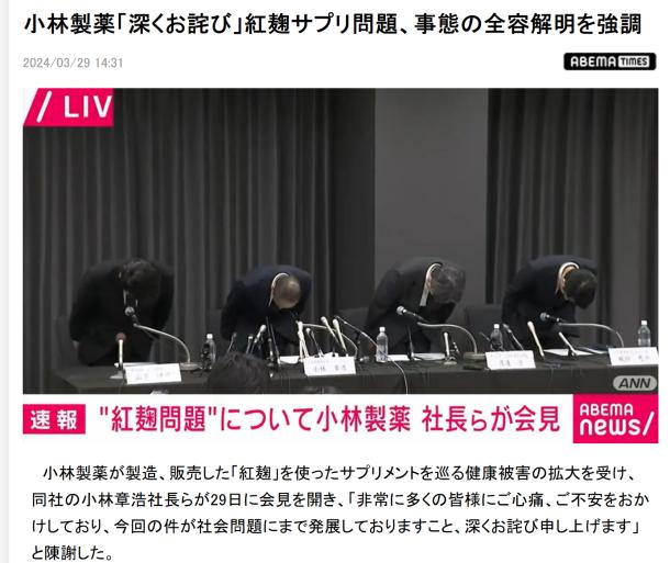 事情發生後,小林製藥公司火速舉行了記者發佈會,直接就是一個鞠躬道歉。在發佈會舉行的3月29日,已經確認到有5名受害者死亡,93人進入了醫院。