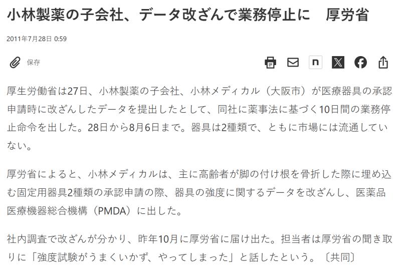 經過筆者調查發現,小林製藥在2011年就有過嚴重的信任危機。小林製藥的子公司小林醫療,曾經開發了一款用於為高齡人羣固定腿部骨折的體內固定器具,但在關於器具的強度試驗中造假,提交給了日本藥監局進行審查。對於這一次的數據造假,小林製藥的態度是道歉,並且向當事外包公司索賠。