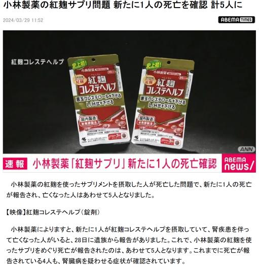 在日本,這類所謂的保健品並不屬於醫藥品,而是屬於保健食品。因此這一次小林製藥屬於出了嚴重的食品安全事故。而小林旗下其他使用了紅曲成分的保健食品,也在強制召回清單中。